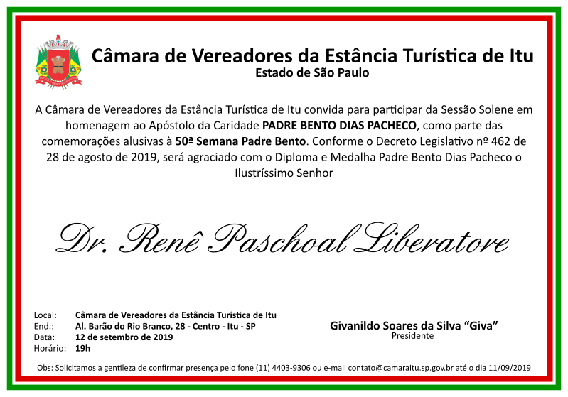 A Câmara de Vereadores da Estância Turística de Itu realizará, amanhã, dia 12, às 19h, no Plenário Luiz Guido, a solenidade de outorga do Diploma e Medalha Padre Bento Dias Pacheco ao Dr. Renê Paschoal Liberatore. A honraria é destinada a pessoas que trabalham na divulgação da vida e obra do “Apóstolo da Caridade”.