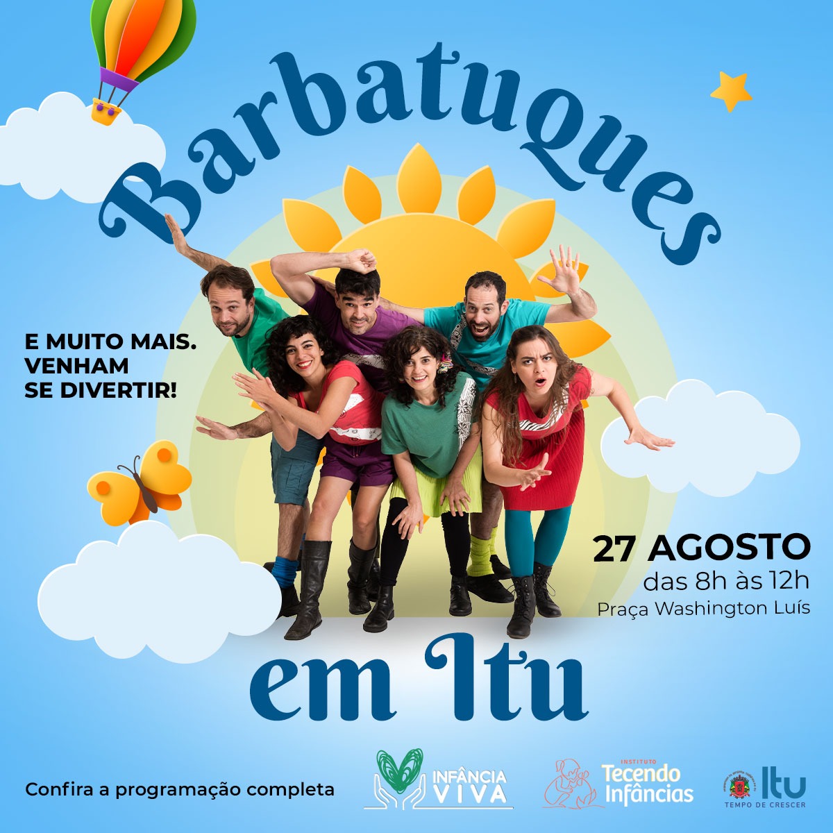 Organizada pela Prefeitura de Itu em parceria com o Instituto Tecendo Infâncias, a Semana da Primeira da Infância contará com ações entre os dias 22 a 27 de agosto em diversos pontos da cidade. Para encerrar este ciclo de atividades, o grupo “Os Barbatuques” fará uma apresentação musical especial na Praça Washington Luís, em frente ao Ginásio de Esportes Prudente de Moraes. A atração será no dia 27 de agosto, sábado, das 8h às 12h. Esta festividade celebra o mês da Primeira Infância e anuncia a construção do “Plano Municipal pela Primeira Infância em Itu”.