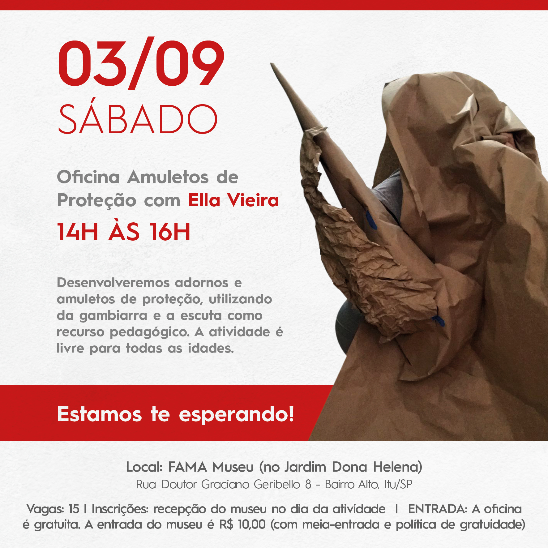 O FAMA Museu de Itu está realizando, neste sábado (3), a “Oficina Amuletos de Proteção” na qual cada visitante é convidado a vivenciar a experiência de desenvolver, através de diferentes materiais e superfícies, instigados pelas questões da atualidade, com sua própria poética, memória e imaginário, adornos e amuletos de proteção, utilizando da gambiarra e a escuta como recurso pedagógico. A atividade é gratuita e o visitante paga apenas o valor da entrada no museu. Público: para todas as idades.