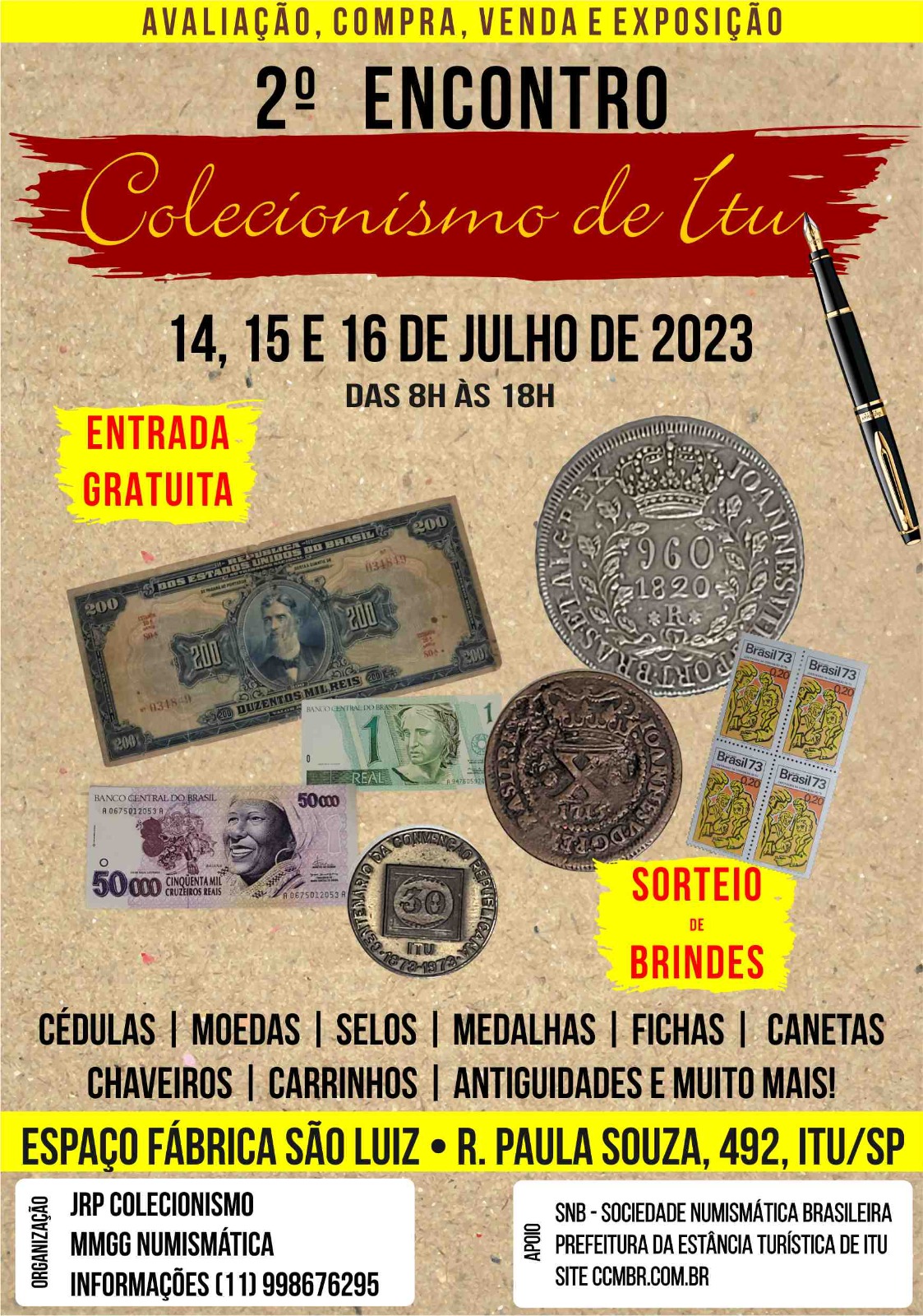 O 2º Encontro de Colecionismo de Itu tem apoio da Sociedade Numismática Brasileira (SNB), da Secretaria de Turismo, Lazer e Eventos da Prefeitura da Estância Turística de Itu e do site CCMBR (Coleções de Cédulas e Moedas Brasileiras).