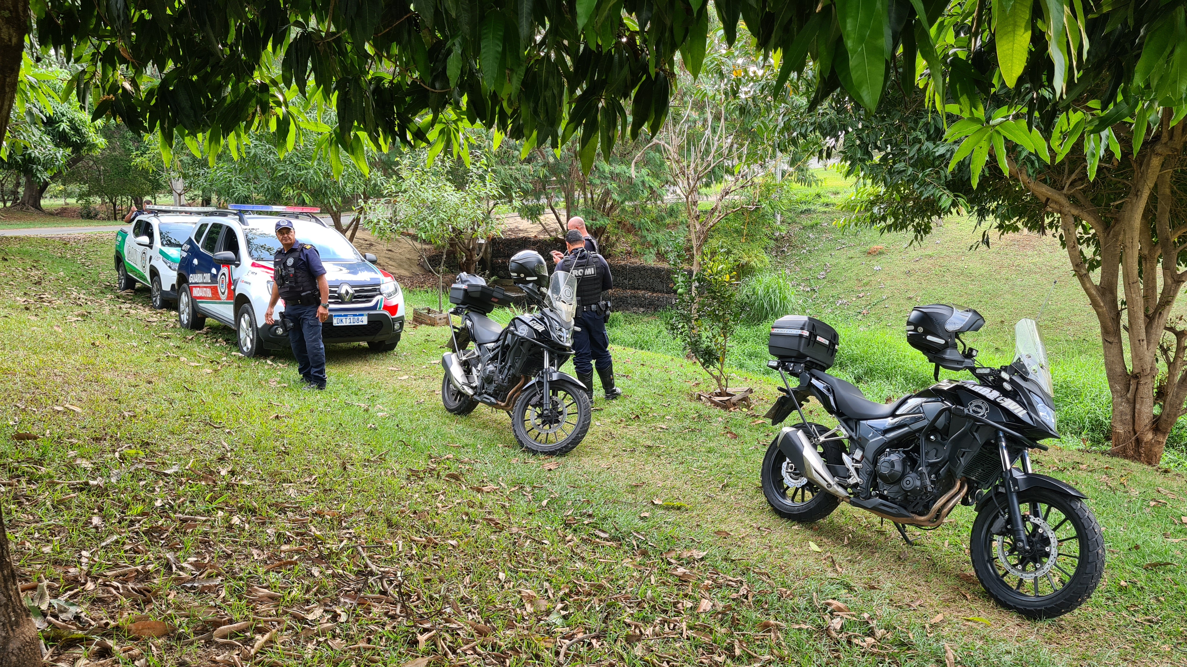 #ParaTodosVerem: A foto, colorida, mostra diversas viaturas da Guarda Civil no parque das Frutas. O local é todo gramado, com diversas árvores e ao lado esquerdo da foto temos o córrego onde o cão foi localizado e resgatado.