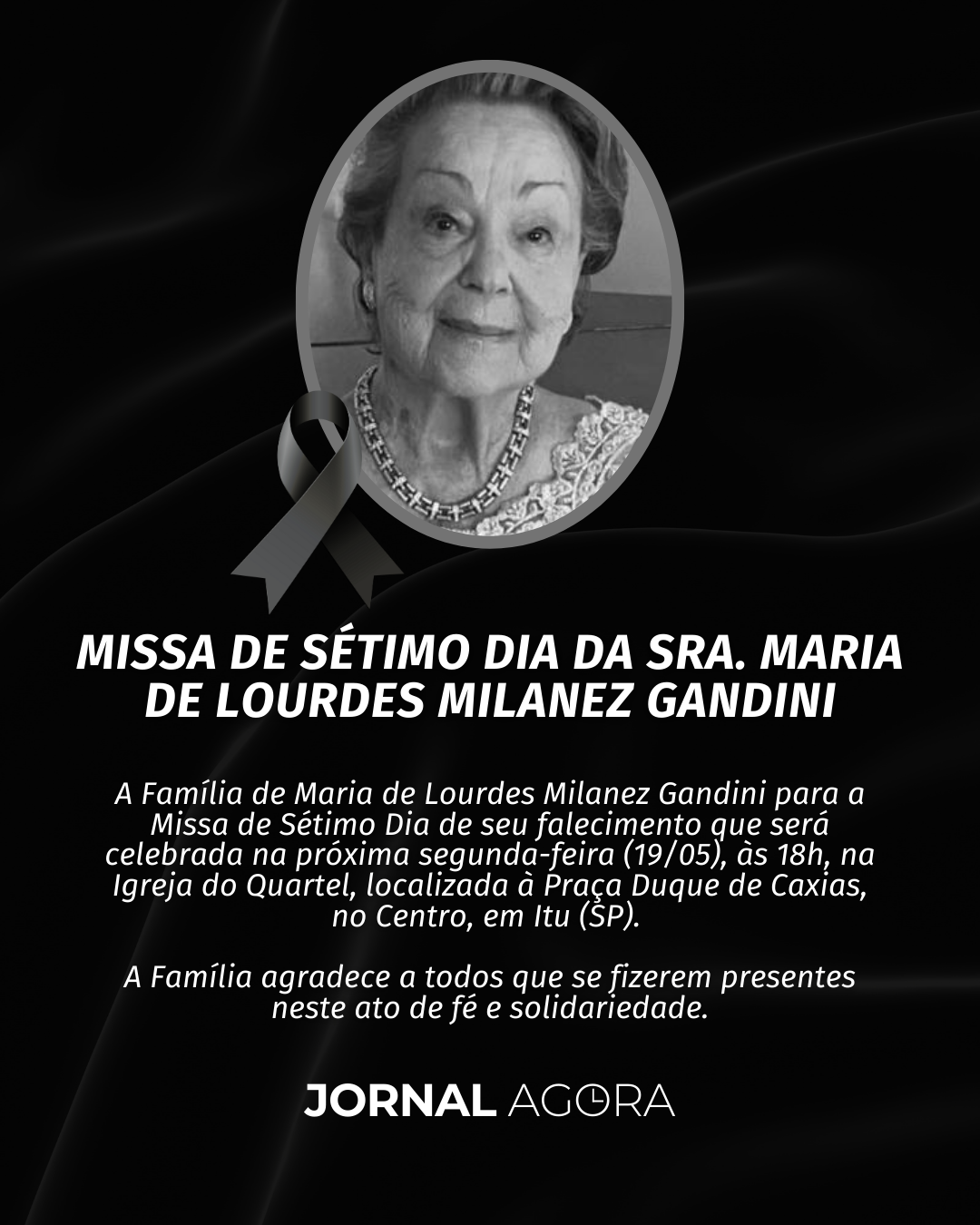 A Família de Maria de Lourdes Milanez Gandini convida para a Missa de Sétimo Dia de seu falecimento que será celebrada na próxima segunda-feira (19/05), às 18h, na Igreja do Quartel, localizada à Praça Duque de Caxias, no Centro, em Itu (SP).