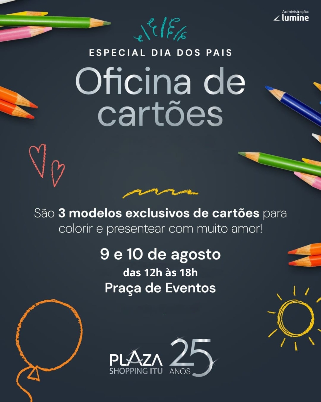 Em celebração ao Dia dos Pais, o Plaza Shopping Itu realiza neste fim de semana uma oficina gratuita para as crianças criarem cartões personalizados como forma de homenagear seus pais. A atividade ocorre nos dias 9 e 10 de agosto, sábado e domingo, das 12h às 18h, na Praça de Eventos do centro de compras.