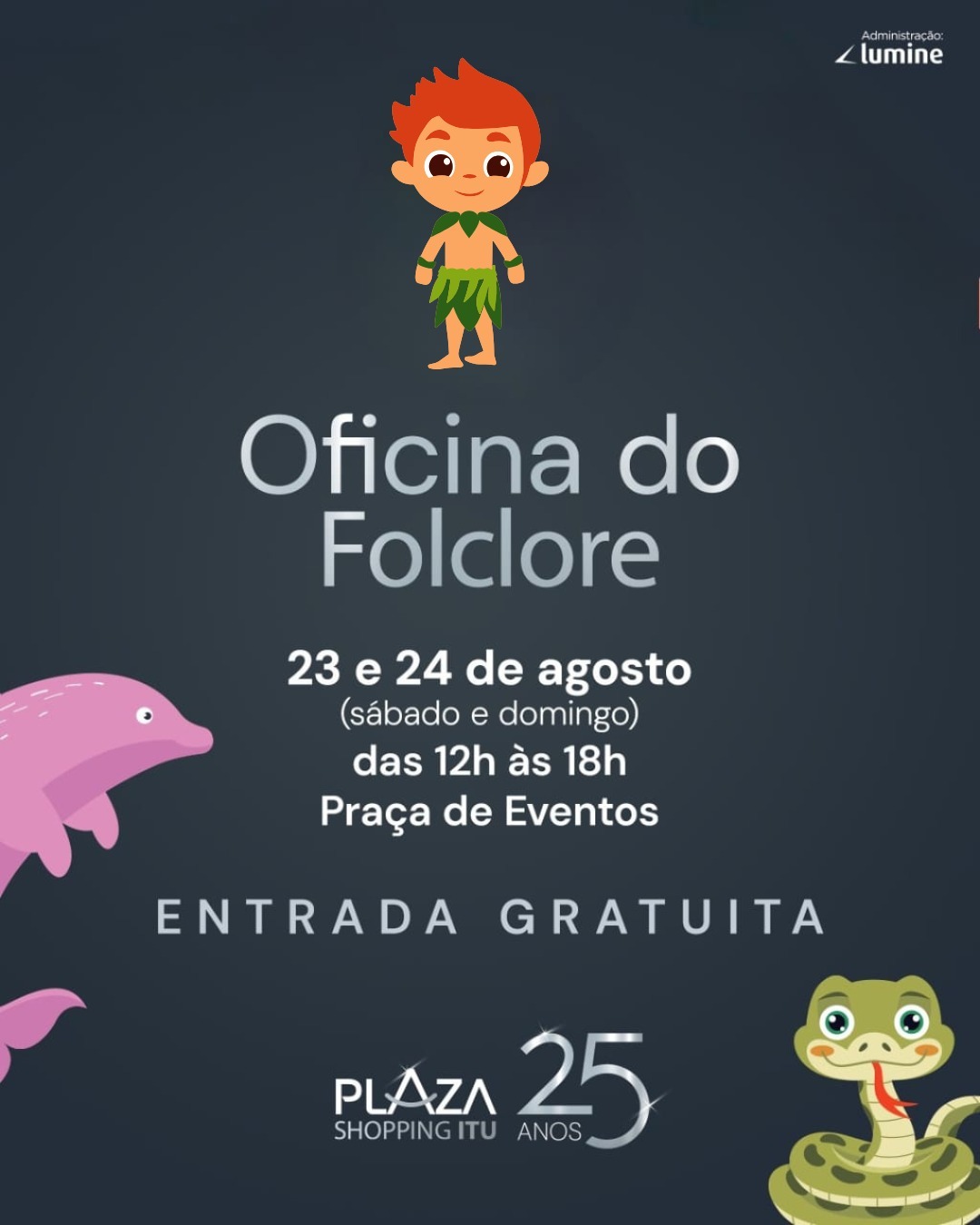 Em comemoração ao Dia do Folclore, celebrado em 22 de agosto, o Plaza Shopping Itu realiza um final de semana especial com Oficinas de Folclore gratuitas para crianças de 4 a 12 anos. As atividades acontecem nos dias 23 e 24 de agosto, das 12h às 18h, na Praça de Eventos do shopping.