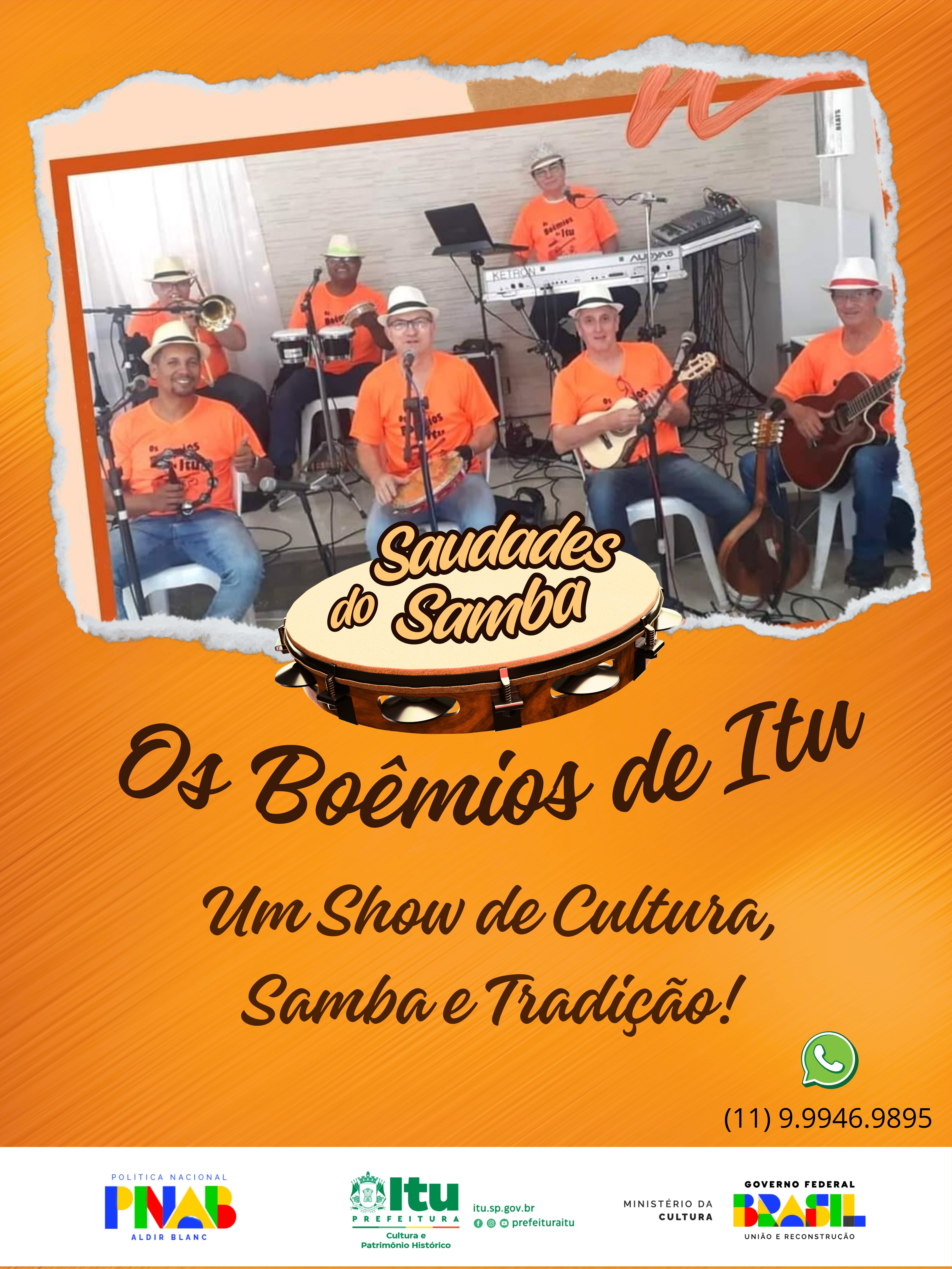O grupo Os Boêmios de Itu, com mais de 15 anos de trajetória, apresenta no dia 7 de setembro, a partir das 11h, o projeto “Saudades do Samba”, na Praça Padre Miguel (Matriz). O evento é uma celebração da música brasileira, resgatando clássicos de artistas consagrados como Noel Rosa, Cartola, Adoniram Barbosa e Martinho da Vila.